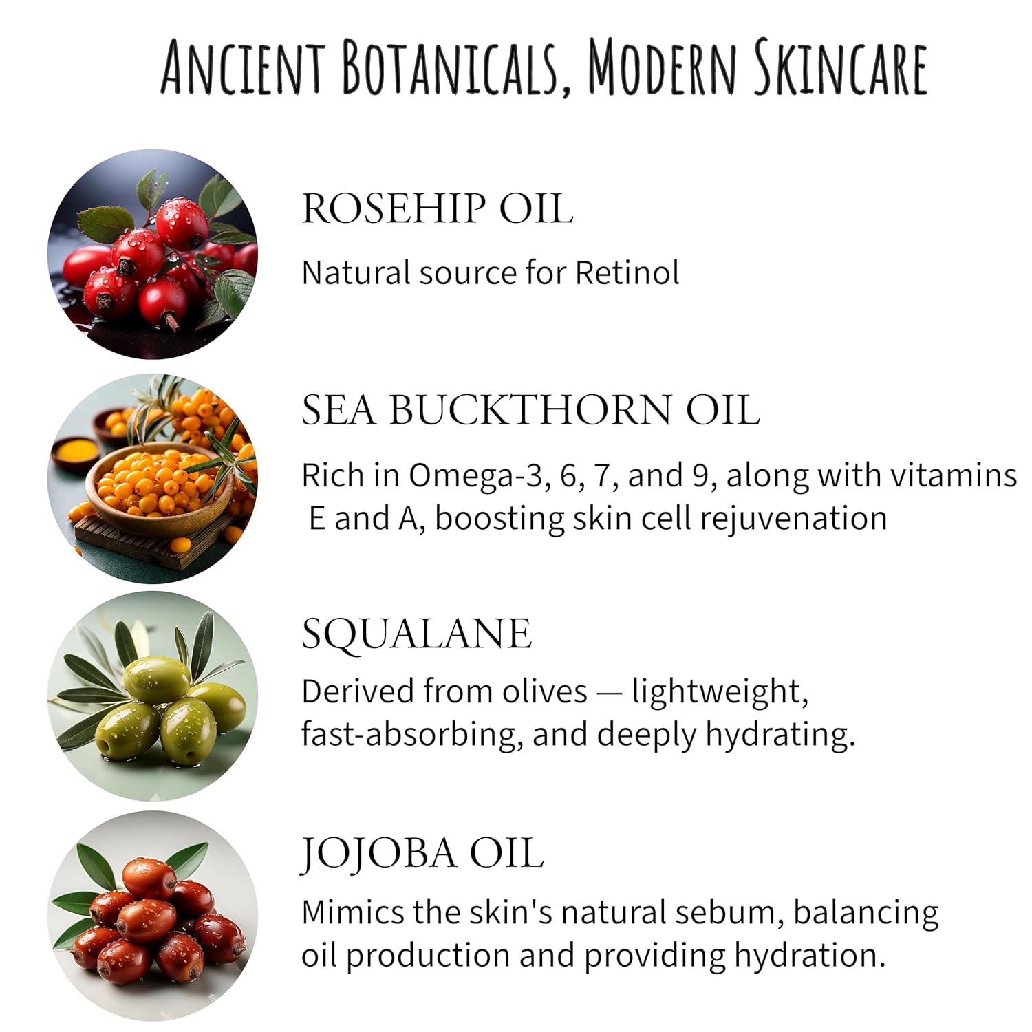 - BOTANICAL FACE OIL WITH OMEGA 3,6,7,9 — Crafted with 10 powerful plant-based oils, including Rosehip and Sea Buckthorn, naturally rich in Omega 3, 6, 7, and 9, along with vitamins and essential nutrients. This lightweight face oil for women deeply hydrates and nourishes, supporting soft, smooth, and healthy-looking skin. Formulated with plant-derived squalane, sourced from olives for a lightweight, silky finish.