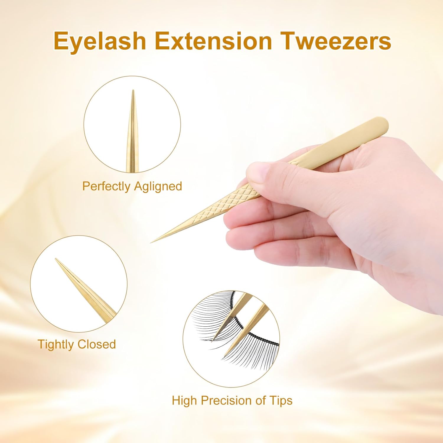 NAGARAKU Eyelash Tweezers, Precision Fiber Tip Tweezer for Eyelash Extensions Diamond Grip Anti-Static Anti-Slip Premium Gold Stainless Steel Pointed Lash Tweezers -Straight Tip Classic Tweezer AG-03