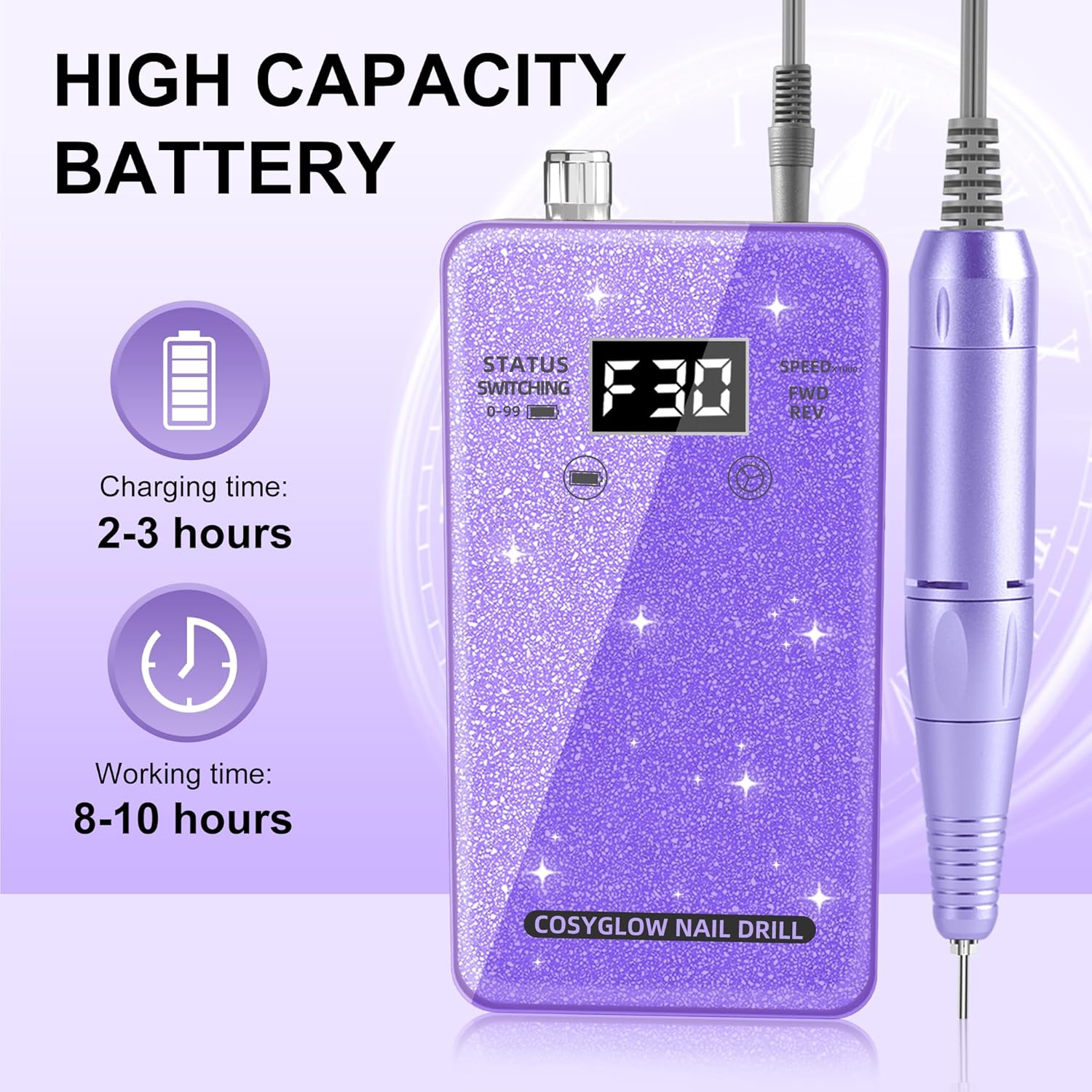 Professional Electric Nail Drill File:COSYGLOW Glitter Portable Cordless E-File Nail Drill Kit with 11 Drill Bits,30000 RPM Rechargeable Nail Drills Machine for Acrylic Nails Gel Polishing(Purple)