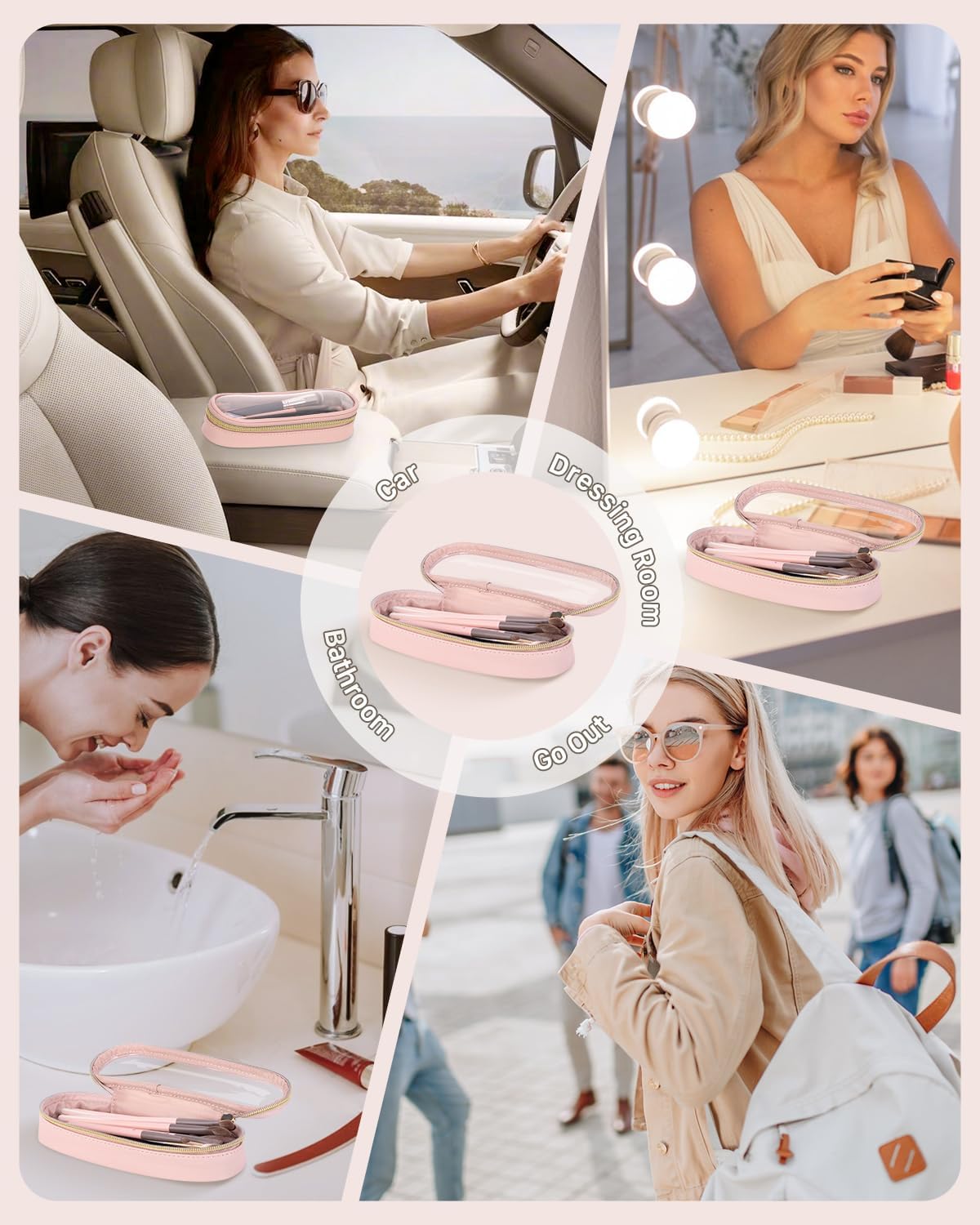 Clear Travel Makeup Brush Holder, Leather Makeup Brush Toiletry Bag, Portable Cosmetic Brush Case, Transparent Waterproof Makeup Brush Storage Bag, Pink, Large