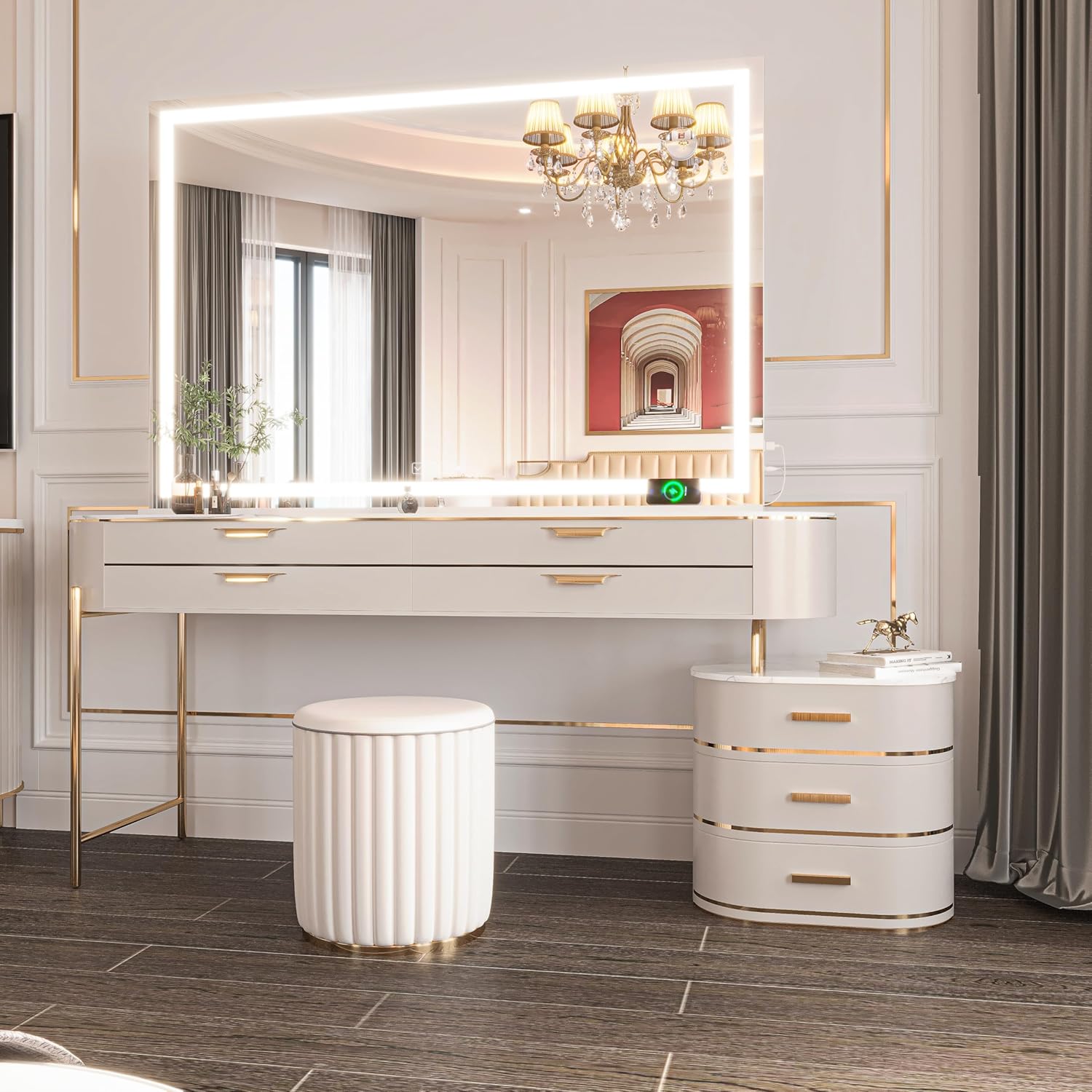 Hasipu Vanity Mirror with Lights and Bluetooth Speaker, 42" x 29.5" LED Makeup Mirror, Lighted Makeup Mirror with Dimmable 3 Modes, Touch Screen Control Vanity Mirror Square White
