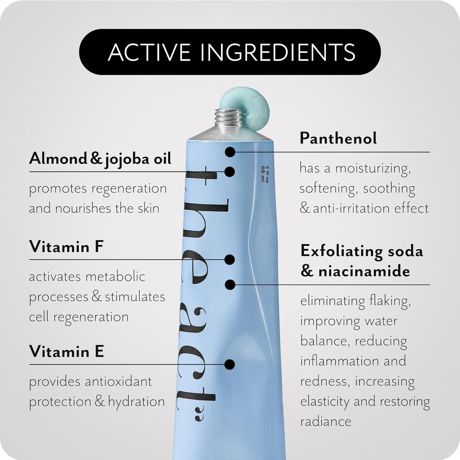 - Active Ingredients : Almond Oil, Jojoba Oil, Baking Soda, Vitamin E, Vitamin F