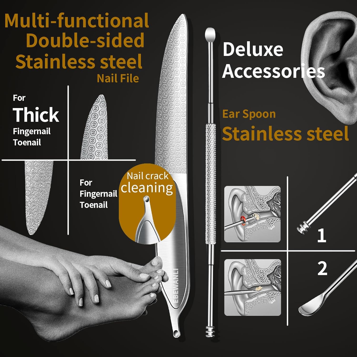 - Practical And Complete EBEWANLI Professional Nail Clippers Kit: Has heavy duty toenail clippers for thick toenails, straight nail clipper for thick toenails, ingrown nail clippers for ingrown toenails, 360 degree rotating side nail clippers for seniors with arthritis, toe nail files for thick nails with ingrown lifters, Comes with multiple tools for comprehensive toenail care.