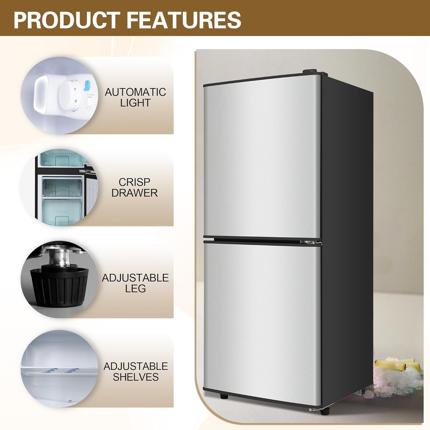 Small Fridge with Freezer 4.2 Cu.Ft., Mini Fridge and Freezer for Dorm with Adjustable Thermostat, Apartmet Size Fridge with Freezer Compact Fridge for Kitchen, Dorm, Office, Silver