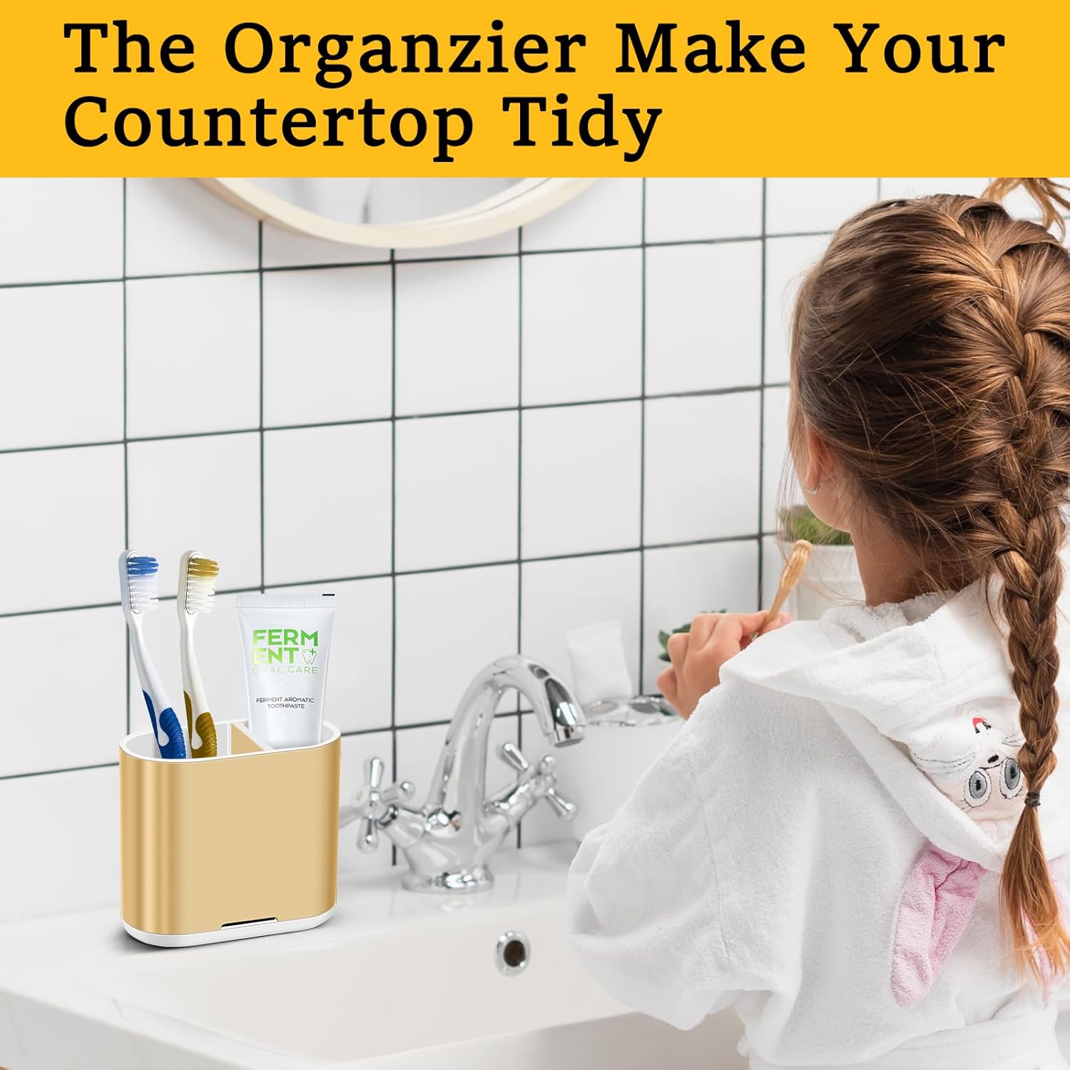 - Compact Size & Divider: The tooth brushing holder size: L4.6"Ă—W2.2"Ă—H4". It doesn't take up a lot of space on the bathroom vanity top, fits in small sink area well. The removable insert of this bathroom storage organizer is made of natural that is environment friendly. When it gets wet, it dries quickly and doesn't mold and no rust risk. This bottom of toothbrush caddy has drain, excellent internal liquidity.