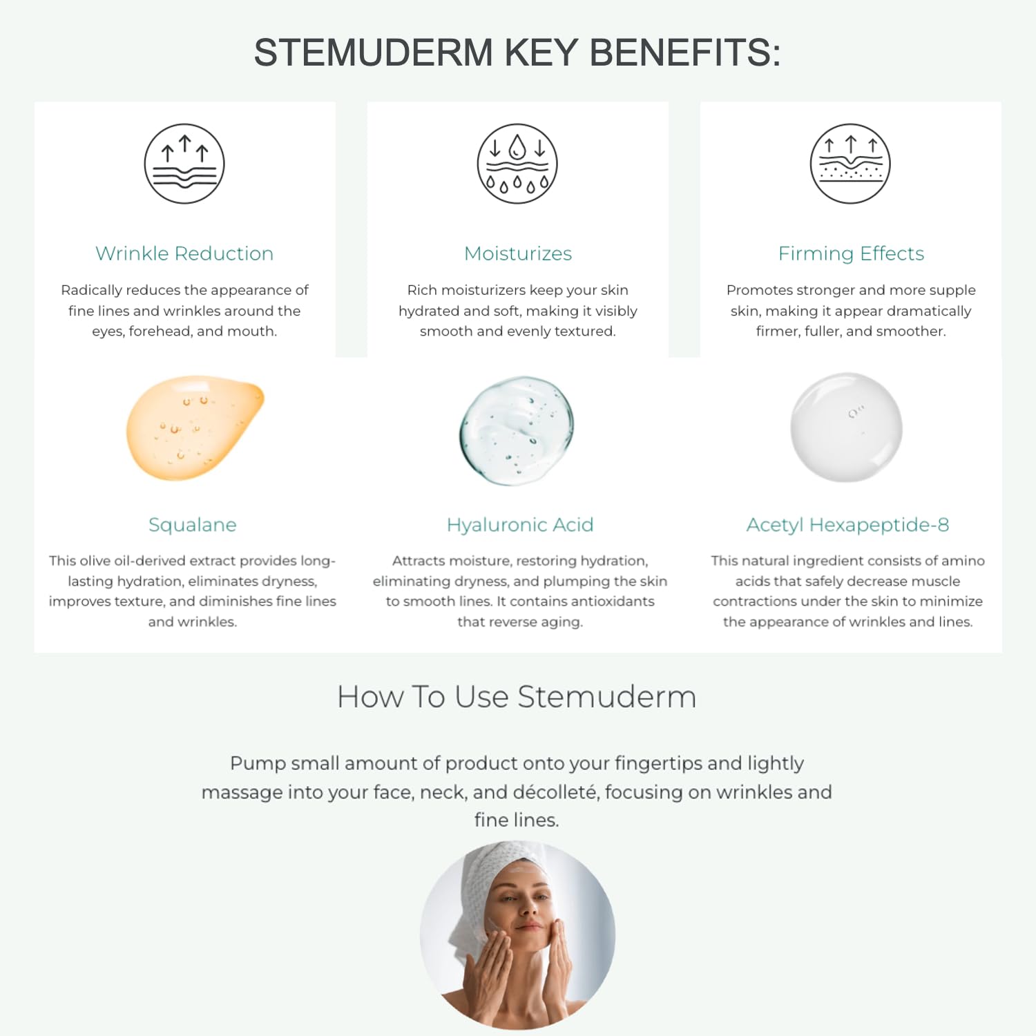- MUSCLE CONDITIONING - The Stemuderm Formula Includes Peptides That Work Beneath Your Skin To Inhibit Repetitive Muscle Contractions And Movements That Stress And Age Your Skin.