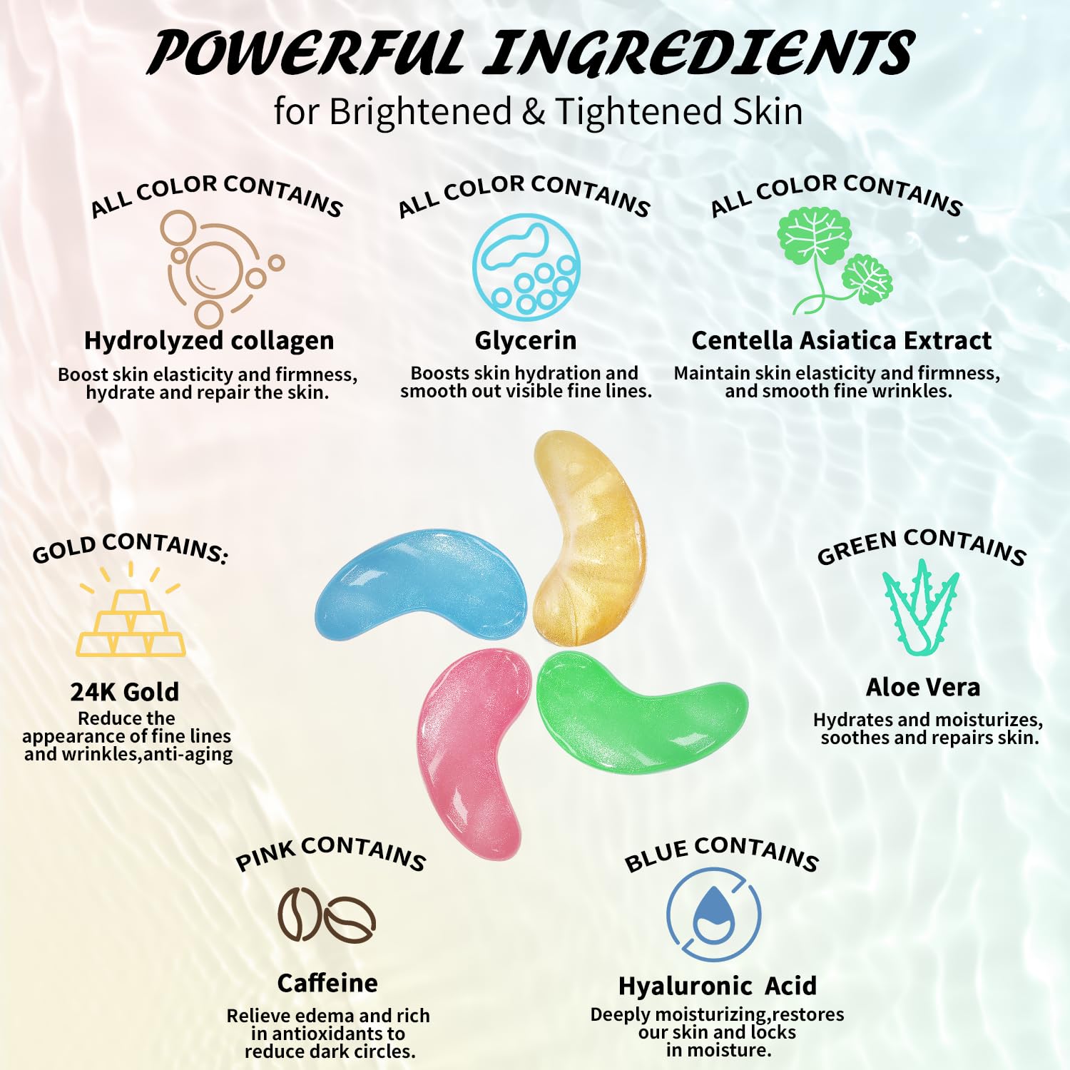 - Safe & Effective Ingredients: Our under-eye patches are infused with a powerful blend of collagen, hyaluronic acid, caffeine, and natural plant extracts which work together to deeply repair, soothe, rejuvenate, and protect the delicate skin around your eyes — without any irritation. The ingredients of our under eye patches for dark circles and puffy eyes are vegan, sulfate-free, and gentle on all skin types.