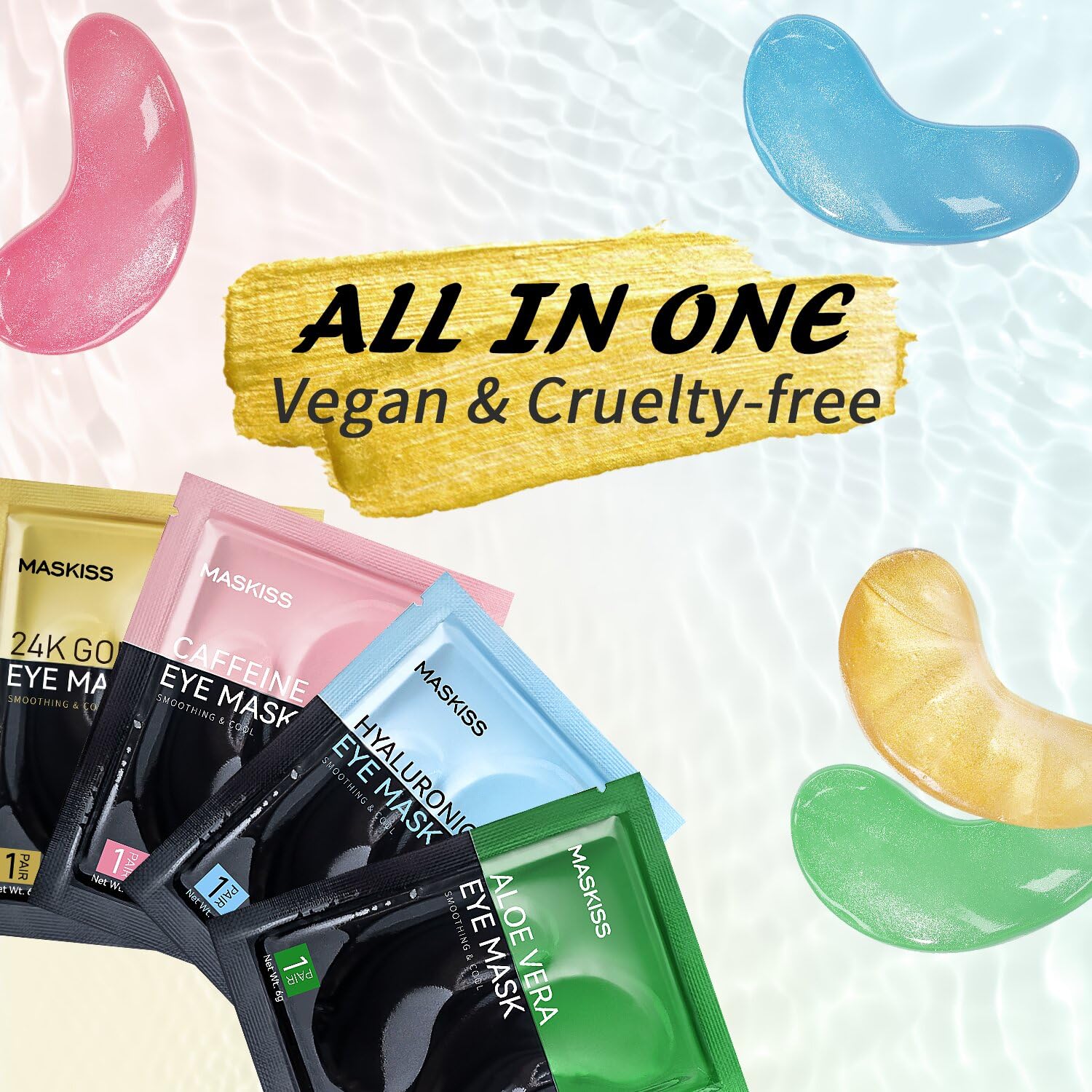- Comprehensive Eye Care Treatment: The Maskiss set includes 4 colors, 8 pairs of under-eye patches. 24k Gold eye mask helps to smooth the skin, reduce fine lines and wrinkles. Caffeine eye patches help promotes eye metabolism and circulation, and reduces eye bags and puffy eyes. Hyaluronic acid eye masks help to fade dry lines and wrinkles, and locks in moisture and nutrition. Aloe vera eye patch helps to reduce pigmentation, repair the healing barrier, and gently moisturize the skin. Add these to your daily self-care routine for a visibly younger, well-rested appearance.