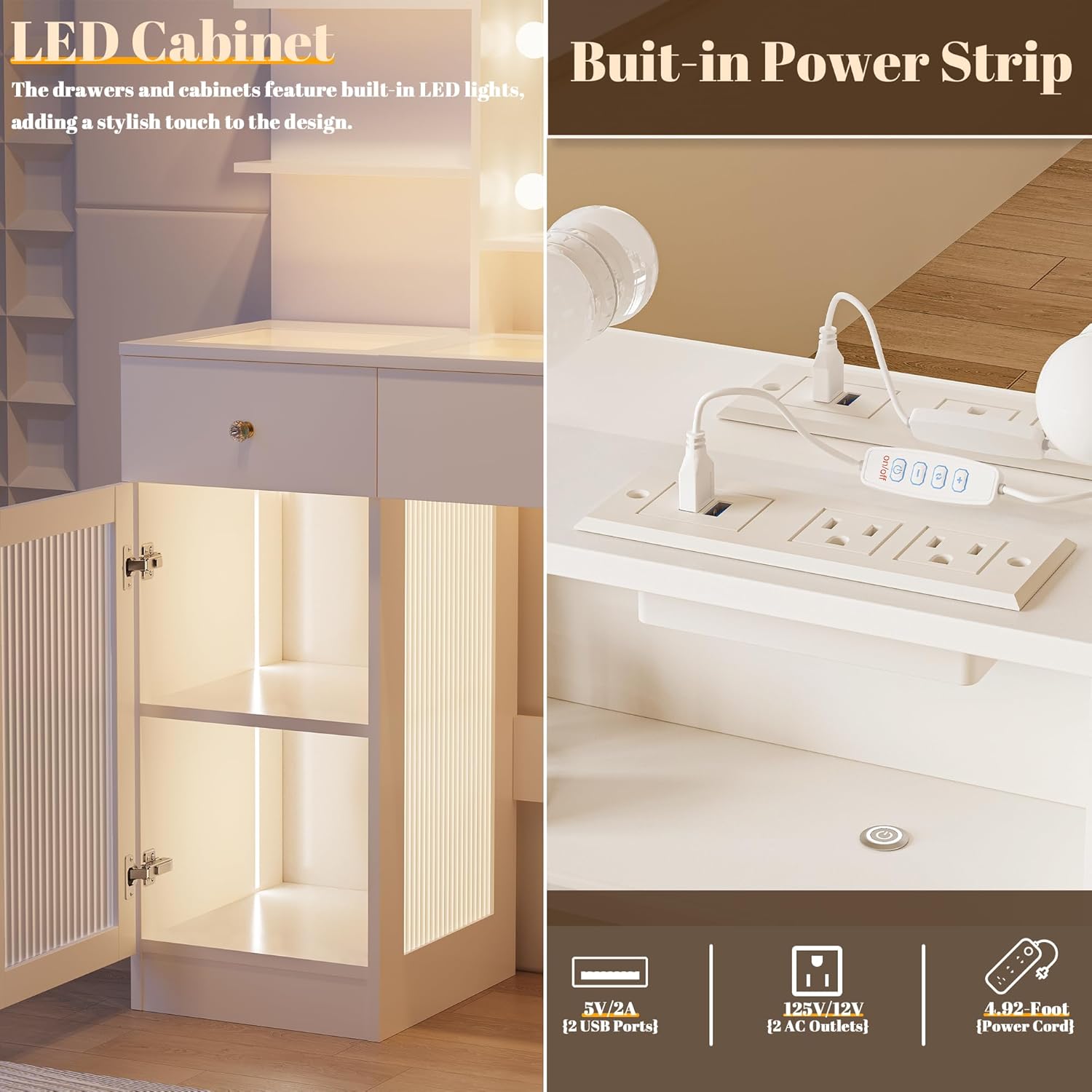 - ăAmple Storage Spaceăwhite vanity with lighted mirror offers a compact design without compromising on storage capacity. With 2 drawer, 3 shelves, and a acrylic 2-tier storage cabinet, you can easily store and access all your makeup essentials, jewelry, perfumes, hair straighteners, and more.