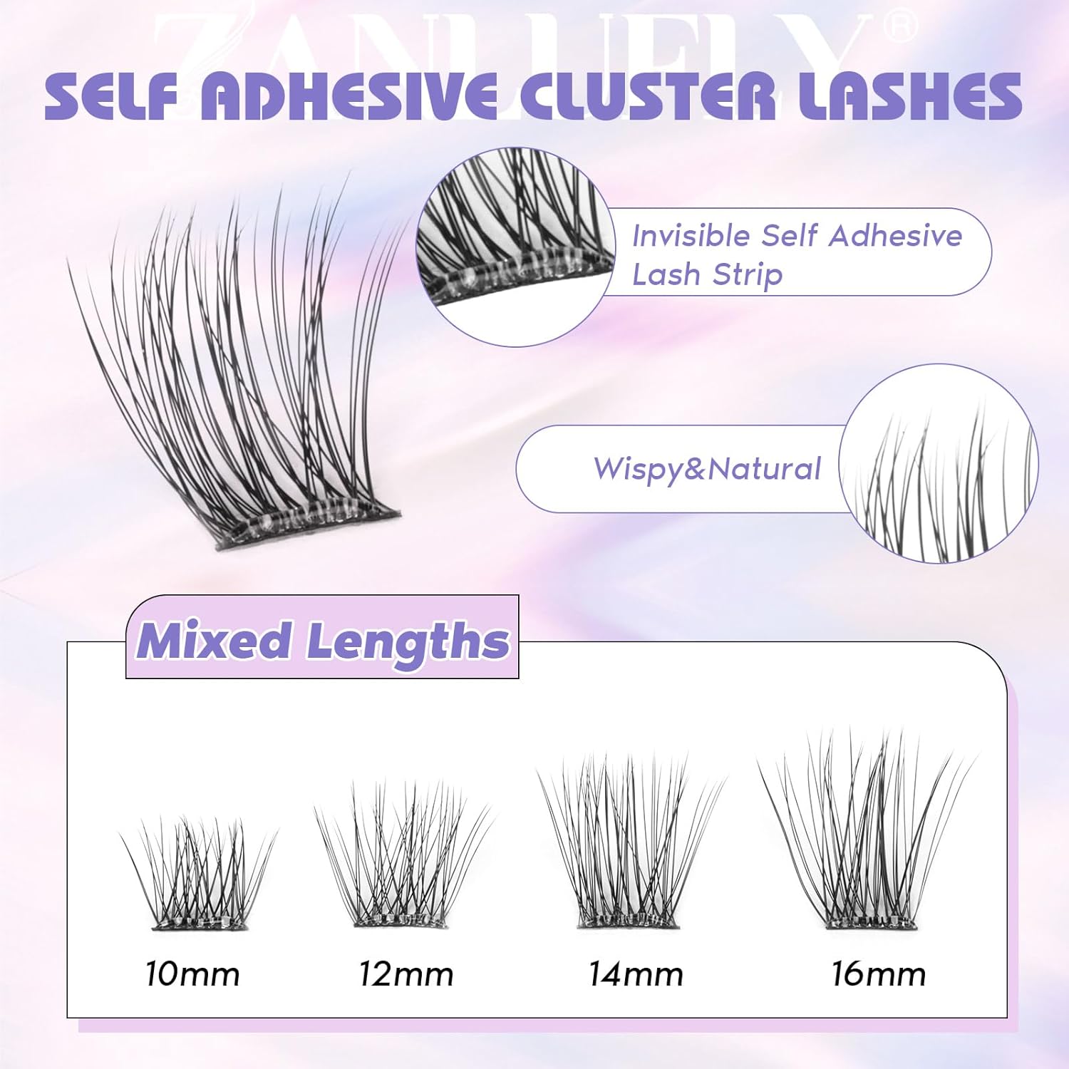 Self Adhesive Cluster Lashes Natural No Glue Eyelash Clusters Self Adhesive Individual Lashes with Clear Strips 10-16MM Wispy DIY Eyelash Extensions by ZANLUFLY