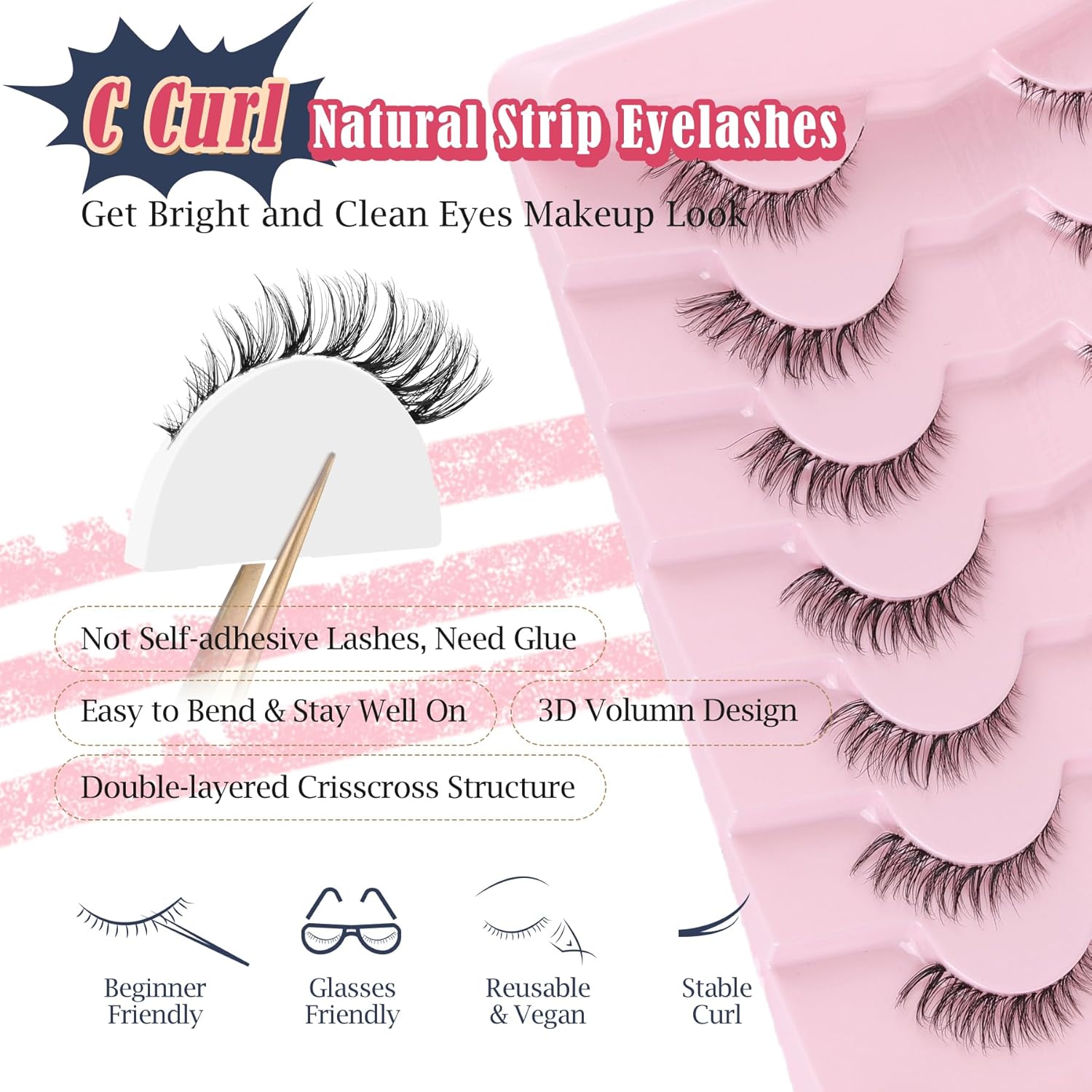 - VEGAN & REUSABLE: 7 pairs lashes pack. The fake eyelashes use ultra-light faux mink fibers, cruelty-free, skin friendly. Bring pretty lashes extension look without damaging your own eyelashes, suit for DAY-TO-DAY use, party and so on