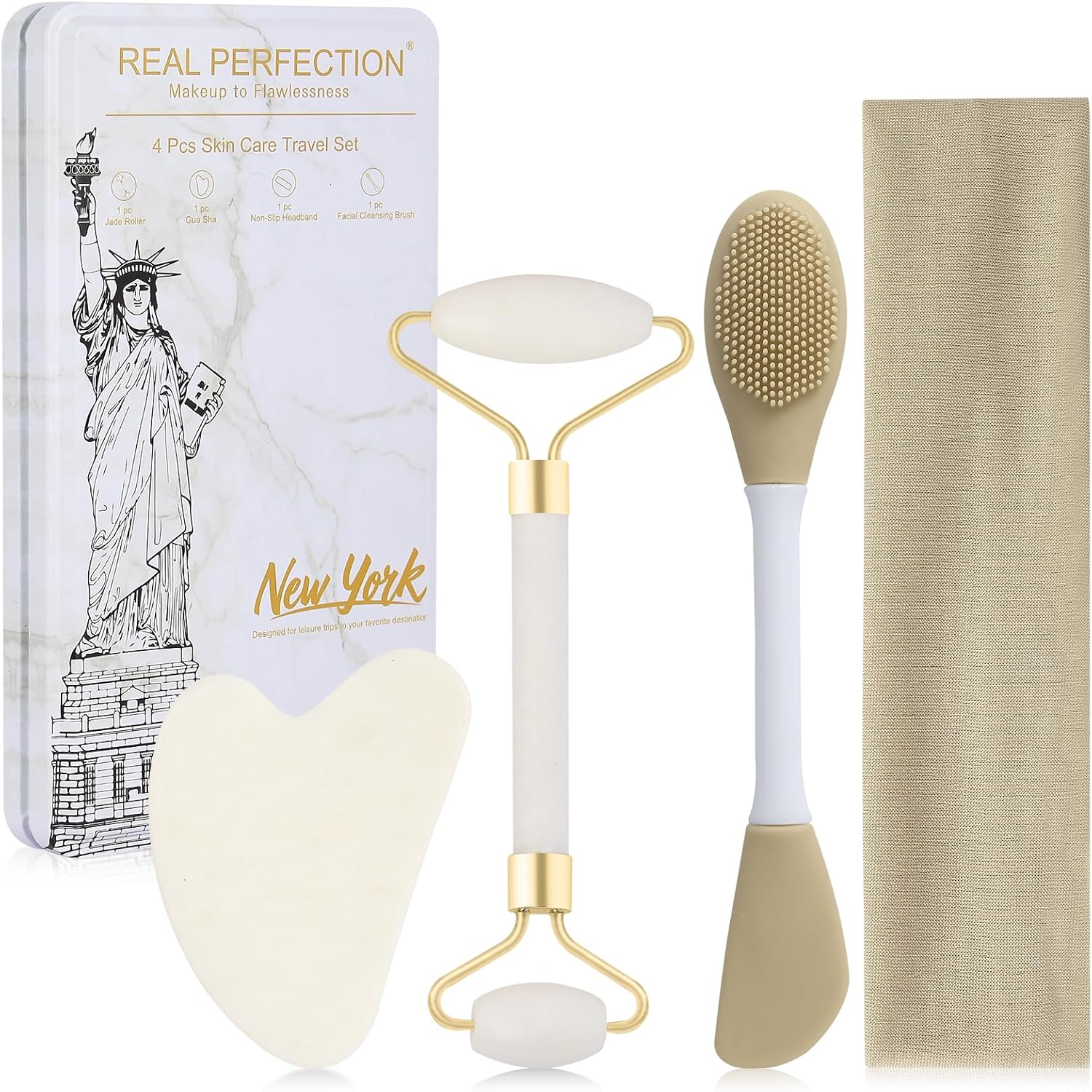 Real Perfection Gua Sha Facial Tools Face Roller for Wrinkles Jade Roller and Gua Sha Set, Scrubber Pore Brush Headband Skin Care Tools for Travel Skincare Routine Massaging Reducing Puffiness - White