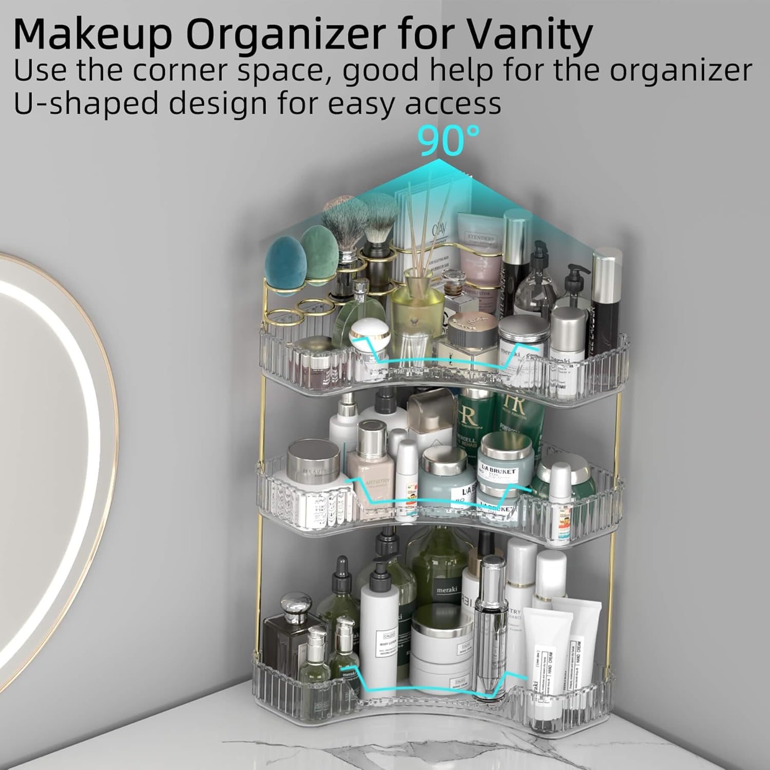 - ă90° Corner Bathroom Counter OrganizerăThe 90° quarter-circle design maximizes the unused space that snugly fits bathroom/vanity corners. Multi-layer structure adds 100% vertical storage while occupying minimal counter space.