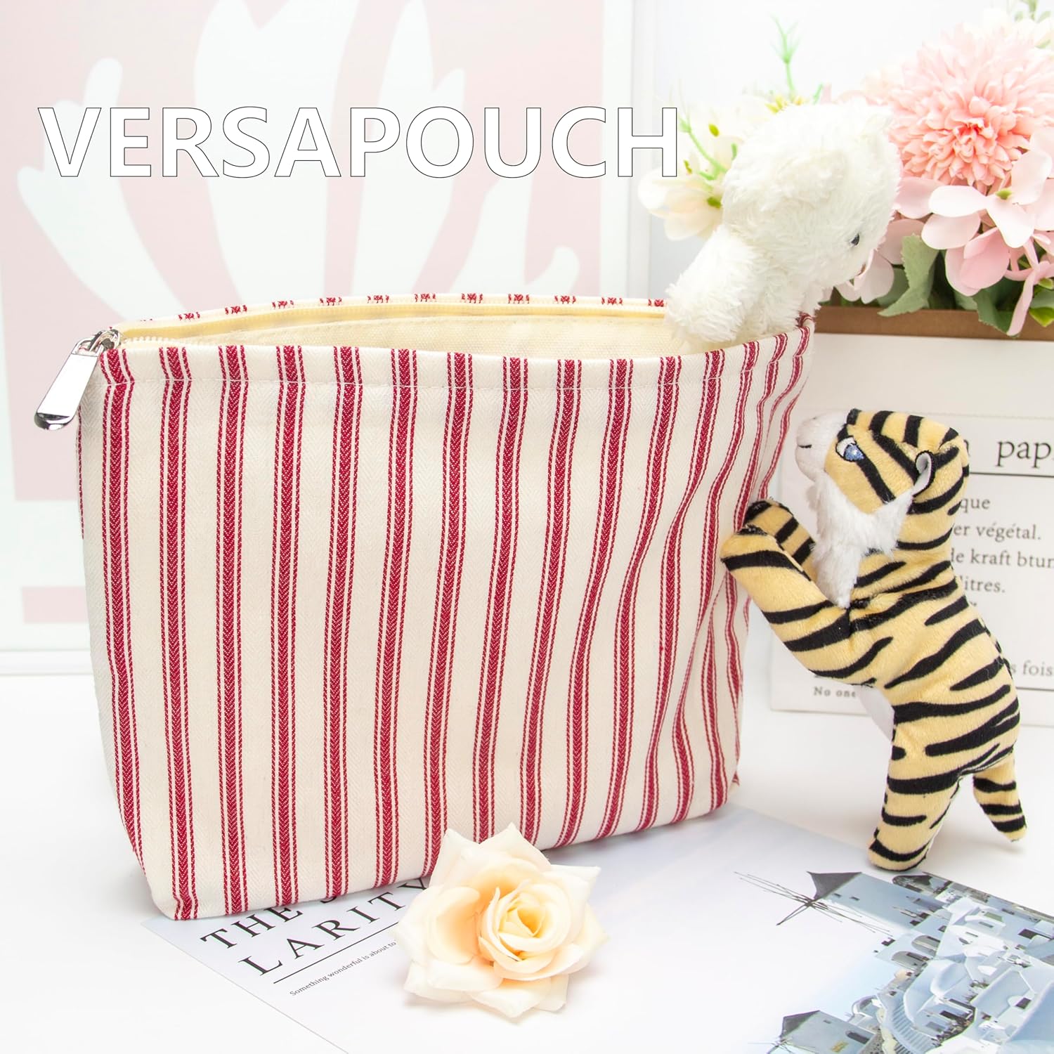 PAZIMIIK Makeup Bag Large Cotton Zipper Pouch for Purse Travel Canvas Make Up Organizer for Women Cosmetic,Vintage Stripe Red