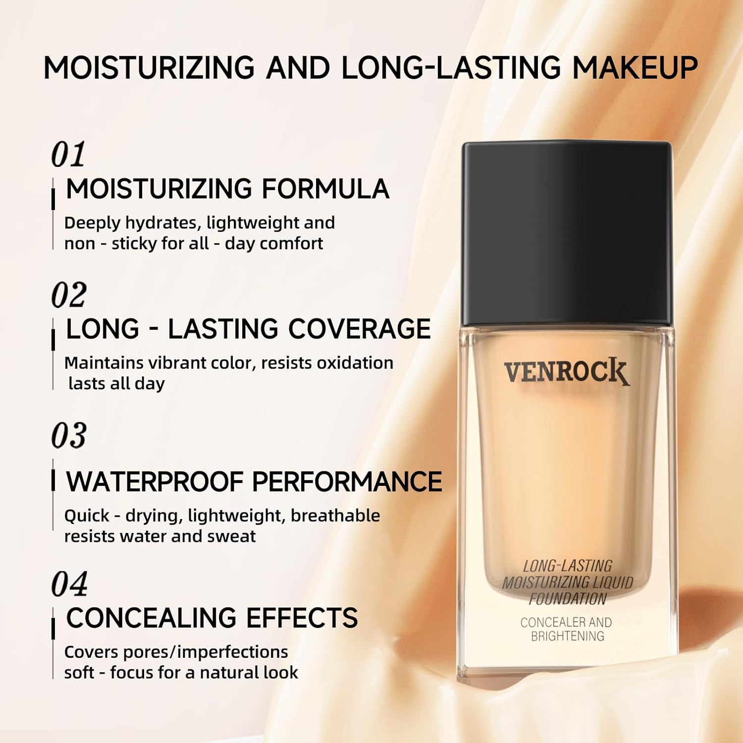 VENROCK 24HR Long-Lasting Moisturizing Liquid Foundation | Radiant, Waterproof, Concealing & Oil-Control (02# Beige, 30ml)
