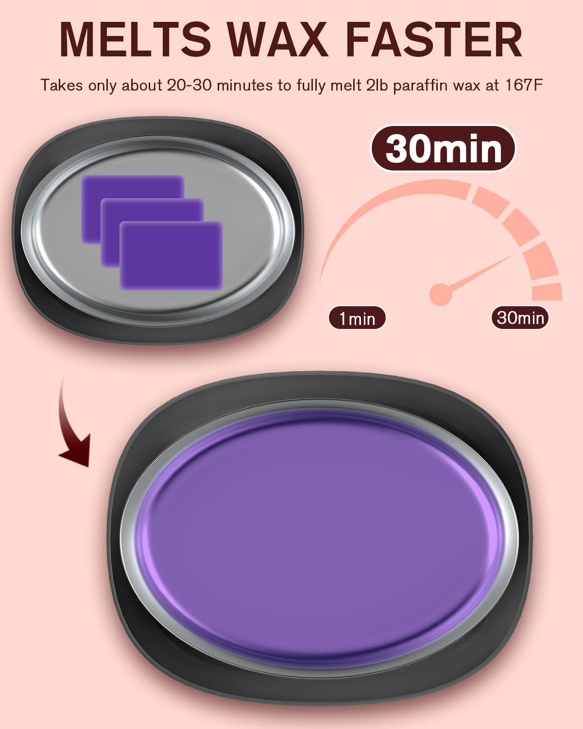- Large Capacity / Quick Heat: paraffin wax machine has a large opening inner container , which offers you enough space to dip your hands, elbows or feet in paraffin warmer machine. Melts wax quickly and evenly , takes just 30 minutes to fully melt 2 lbs of paraffin wax at 167 °F. Turn Off the machine when dipping