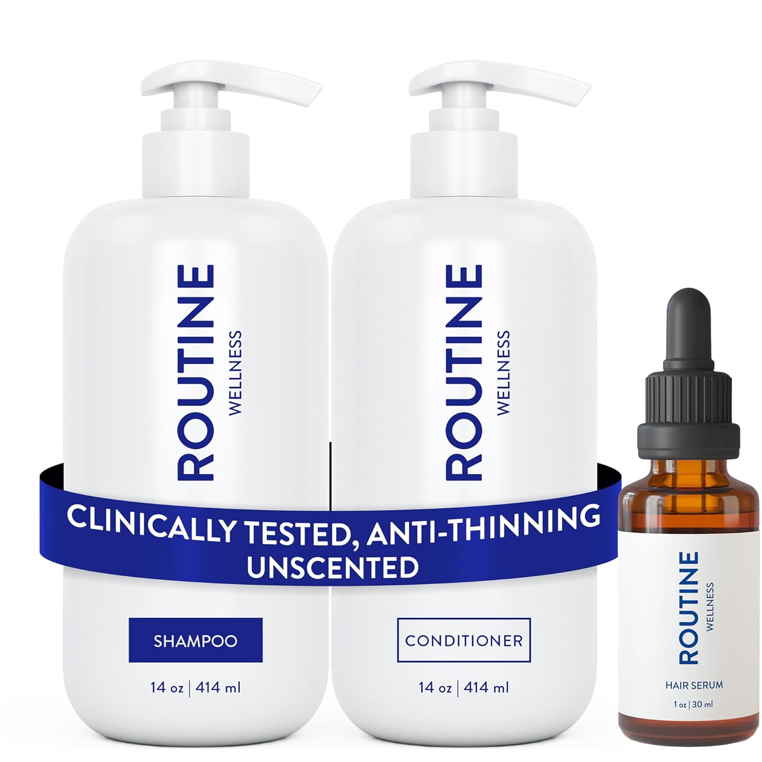 Routine Wellness Shampoo and Conditioner Set and Hair Serum for Thinning Hair - DHT Blocker Women & Men - Color Safe Shampoo for Hair Loss & Hair Growth - Unscented Set + Serum