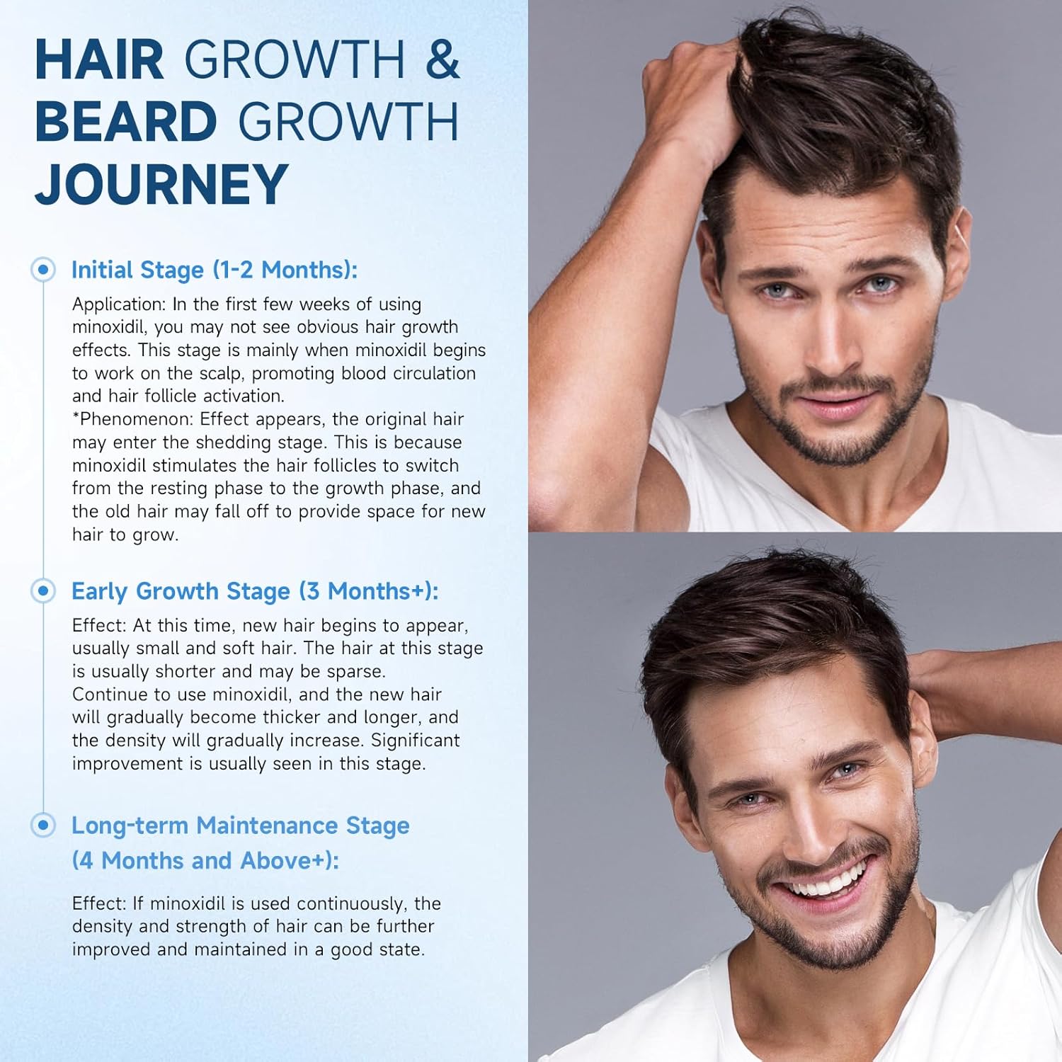 - Easy to use: Our Minoxidil hair growth spray design, Compared with the dropper method, the spray method can more evenly distribute minoxidil to each hair follicle and revives dying hair follicles. For optimal results, simply apply a few sprays to your beard/scalp loss area, gently massaging until fully absorbs the nutrients. Hair Growth Spray is use twice daily in the morning and evening