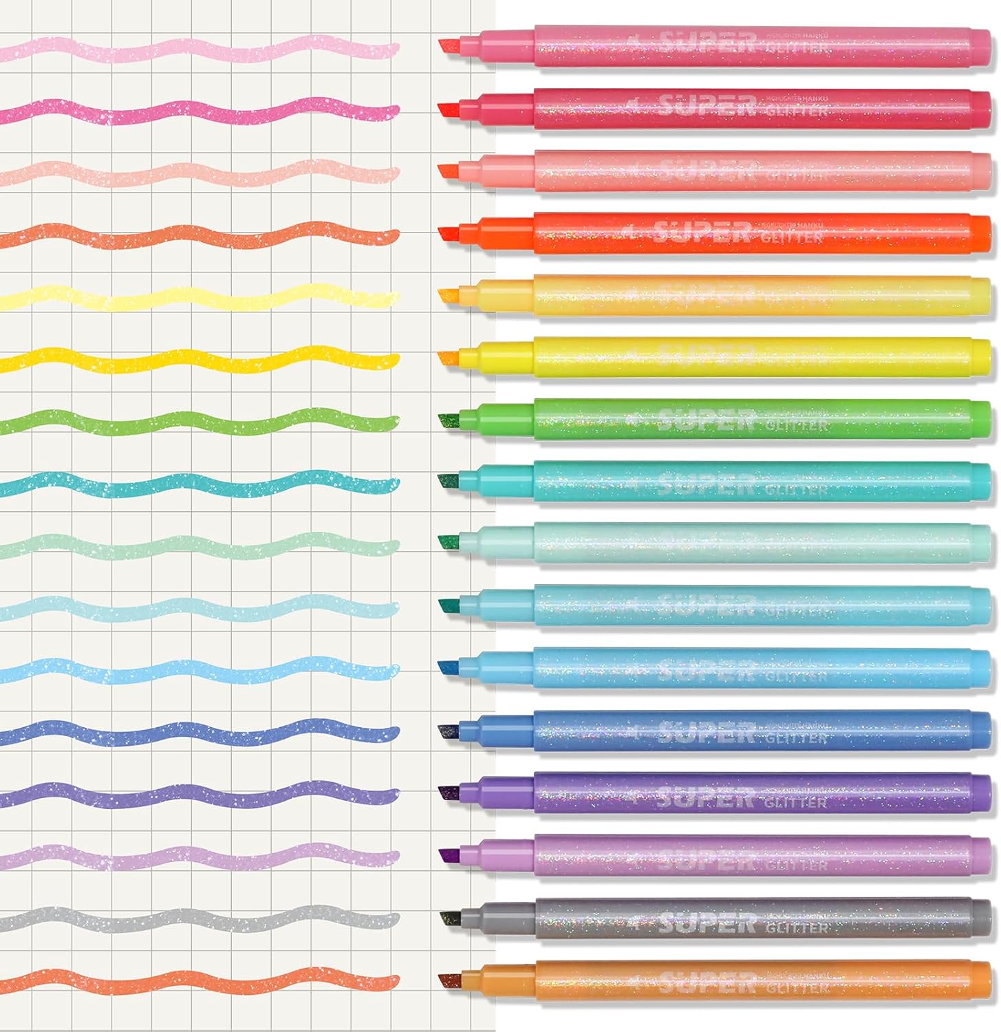 - 【Make your notes pop and your creativity sparkle】Our vibrant collection of 16 glitter highlighters goes beyond ordinary marking. Illuminate your studies, journals, projects, scrapbooks, and planners with dazzling pastel & neon colors packed with shimmering sparkle