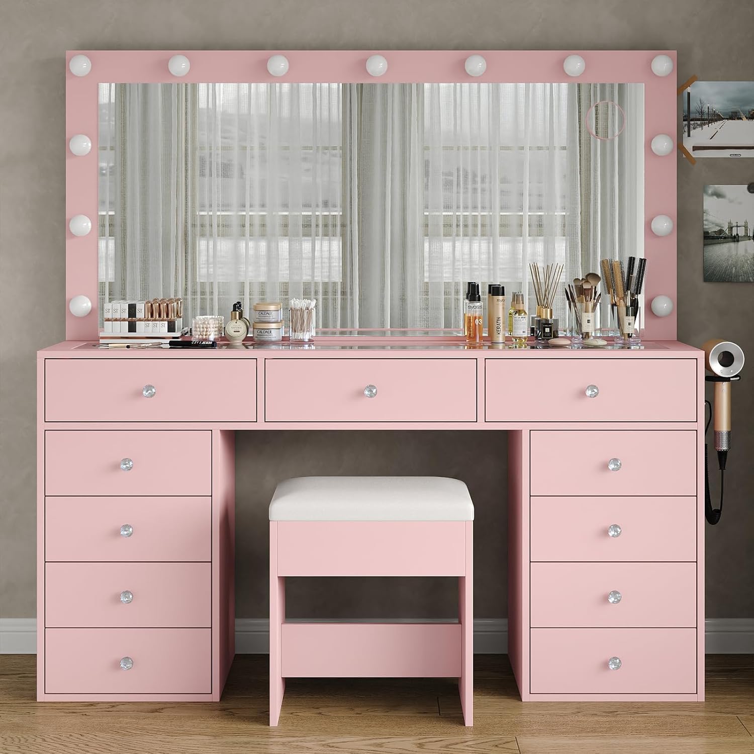 - Spacious Beauty Storage: Say goodbye to messy makeup drawers! The enlarged desktop provides you with more makeup space, ensuring a delicate makeup. You can appreciate the necklaces and jewelry stored in the top drawer through the glass desktop. Our vanity is equipped with 11 generous drawers, providing ample space for all your cosmetics, skincare, and haircare essentials