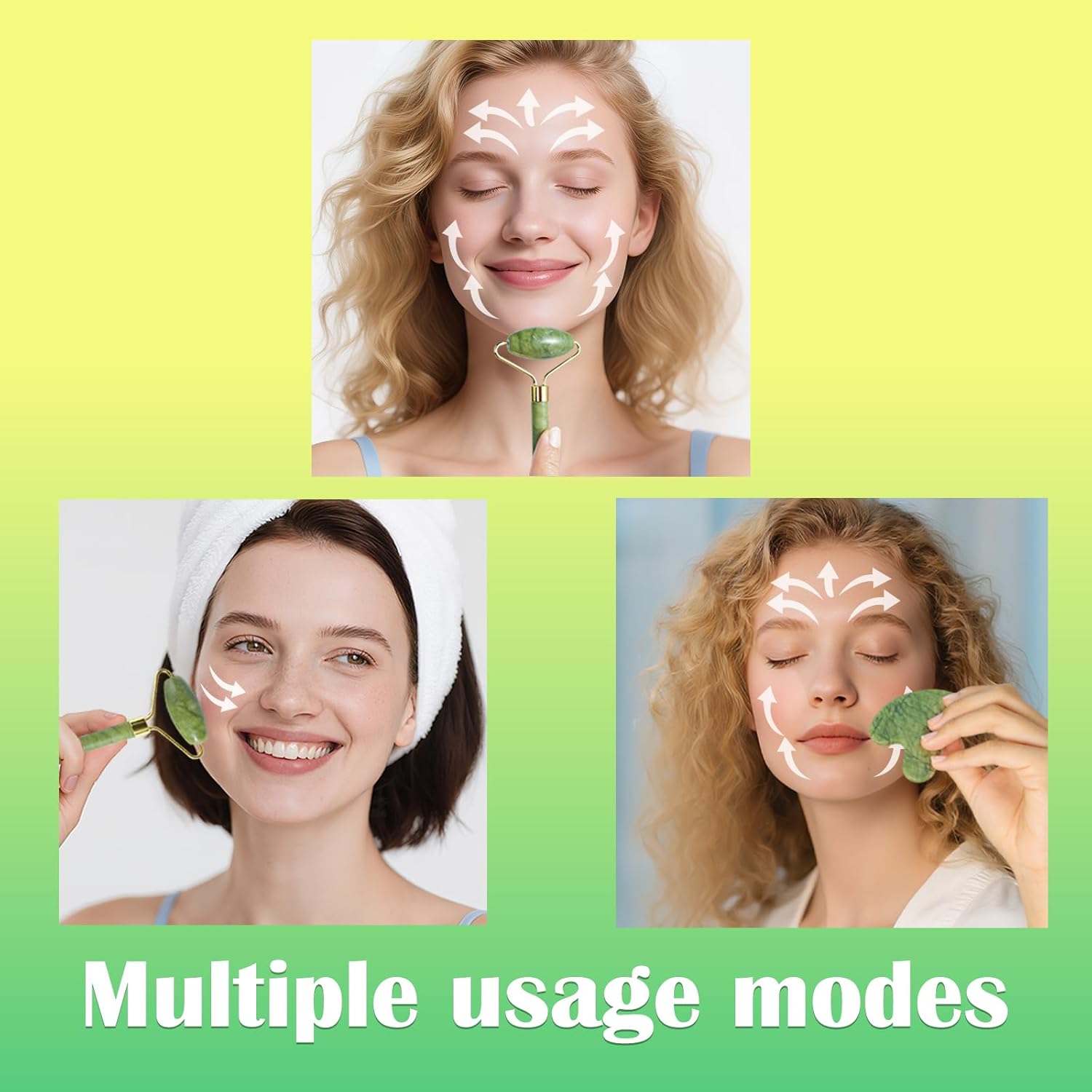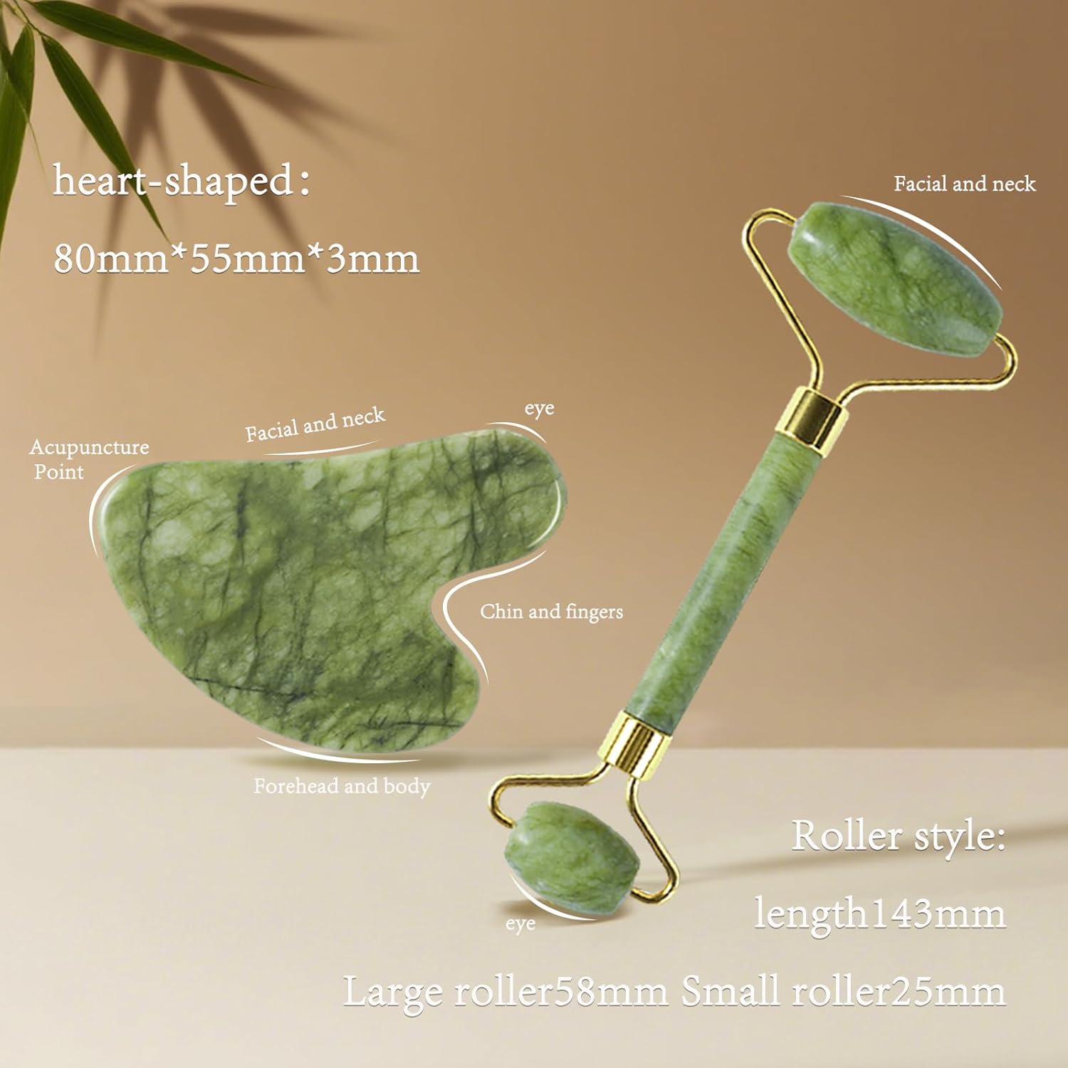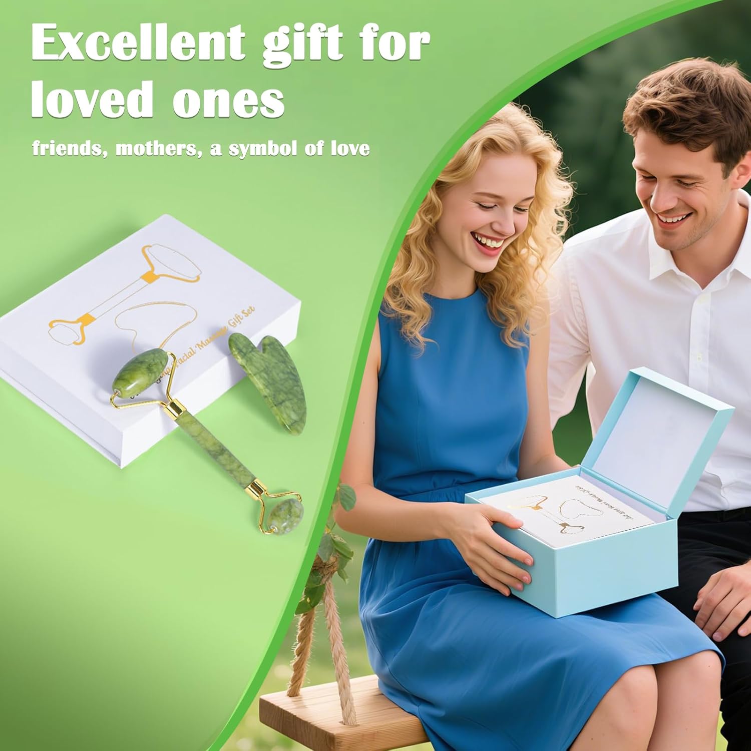 Natural Jade Roller & Gua Sha Set for Face, Facial Massager Tool for Skin Tightening, Anti-Aging, Puffiness Relief, Lymphatic Drainage - Spa Skincare Gift Set for Women