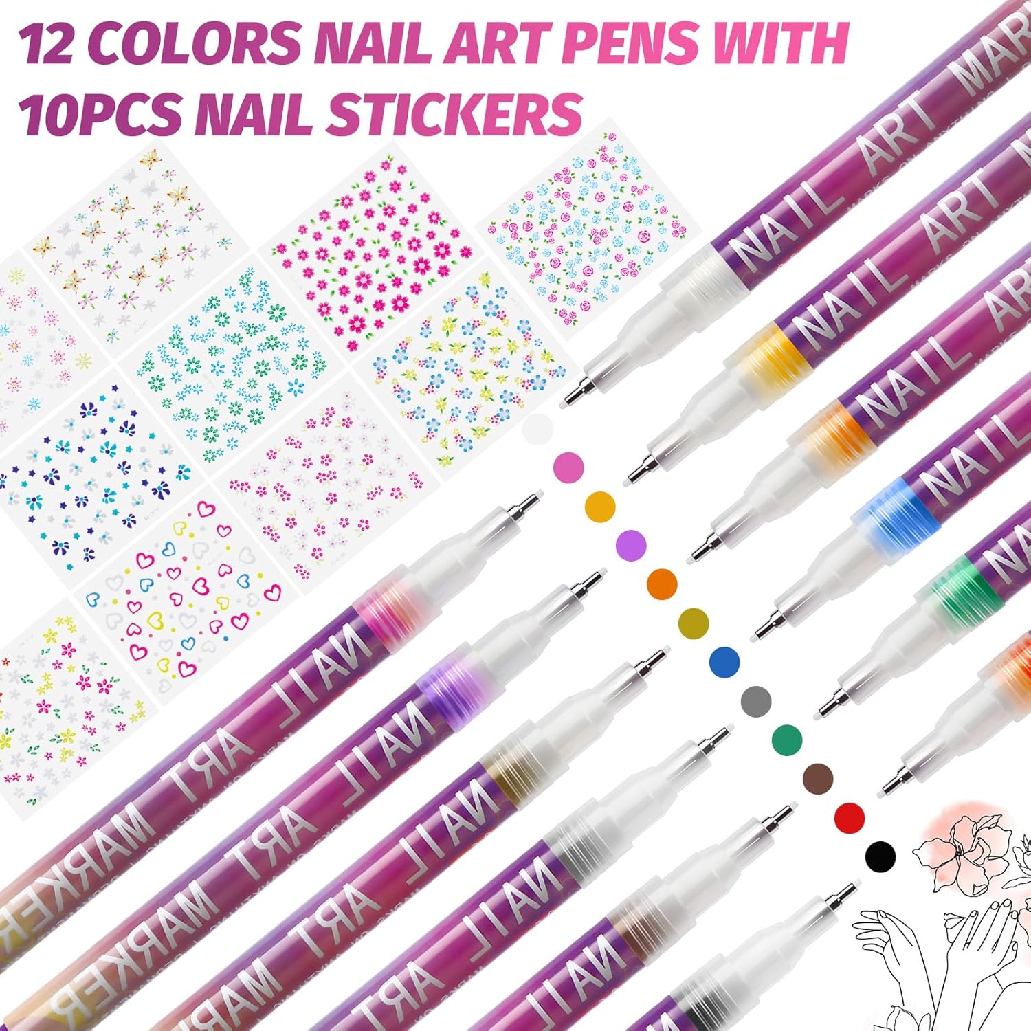 miikoul 12 Colors Nail Art Pens Set 0.7mm Art Graffiti Pen with 10PCS Nail Art Stickers 3D Nail Polish Paint Pens Quick Drying Waterproof Drawing Marker Pen for Nail Art Drawing and Salon DIY