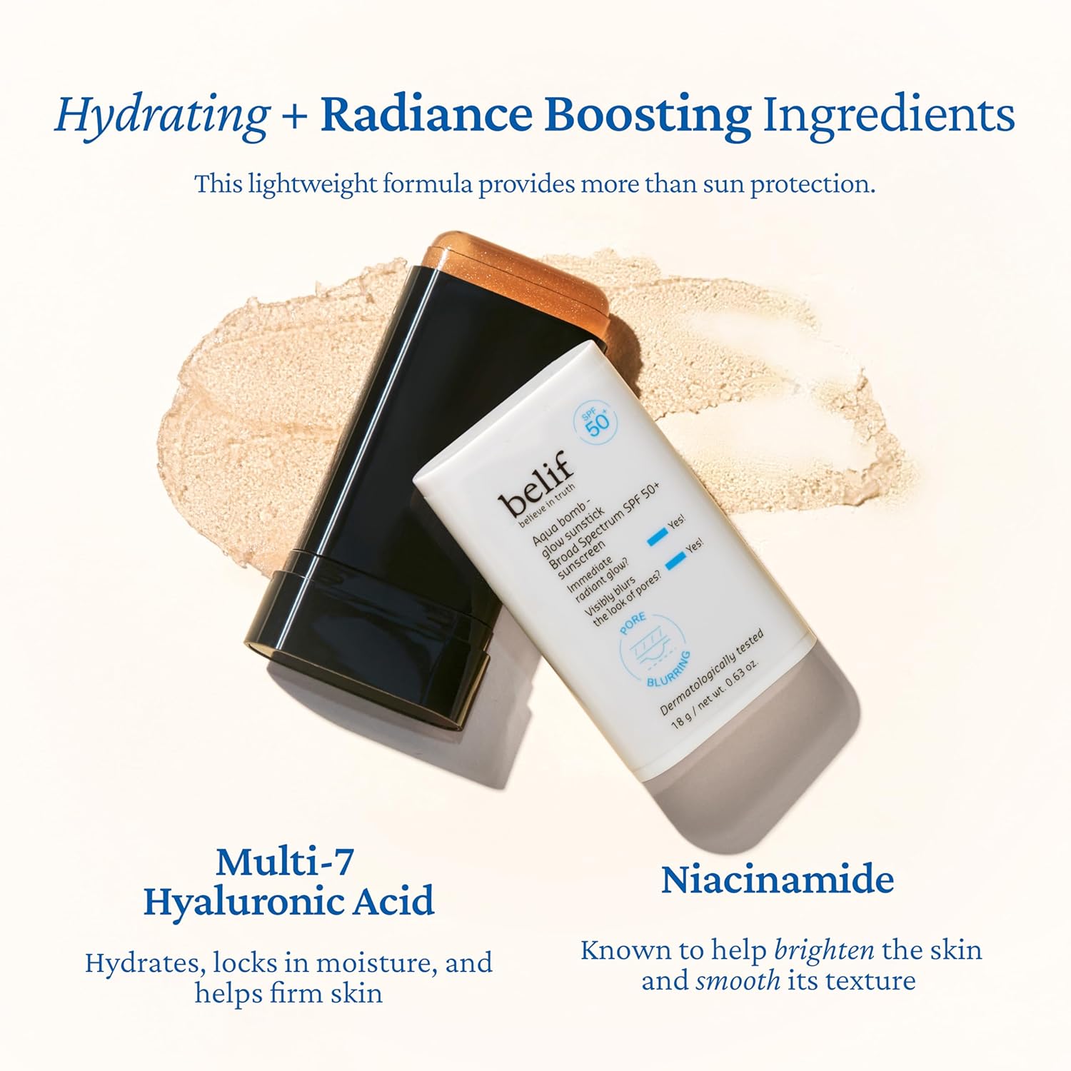 - Lightweight, Dewy Glow: Inspired by belif’s Aqua Bomb hydration, this clear, non-greasy sunstick glides on effortlessly to deliver a refreshing, cooling sensation while leaving behind a natural glow. It blends seamlessly into all skin tones without any white cast or sticky residue.